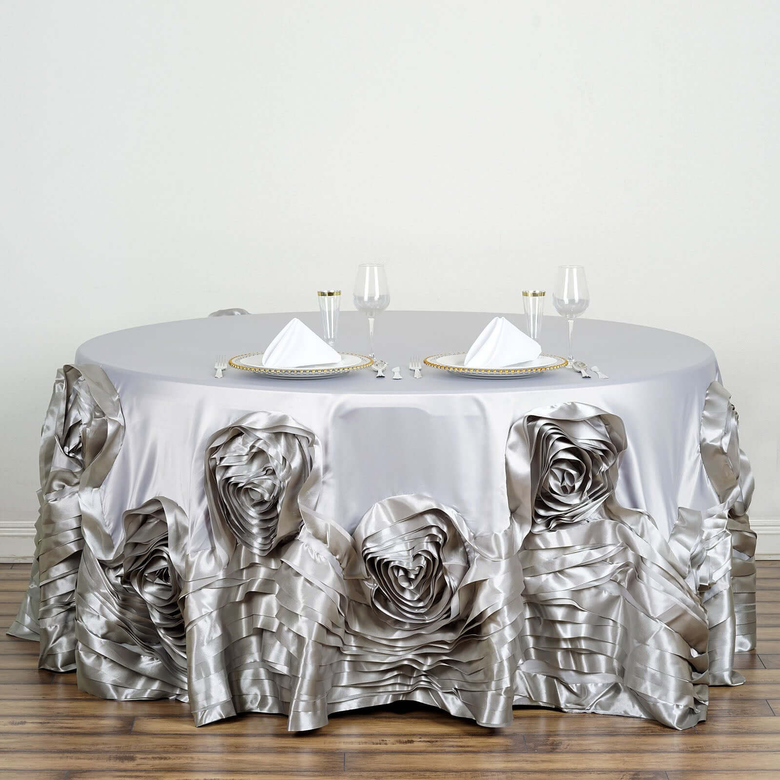 Silver Seamless Large Rosette Round Lamour Satin Tablecloth 120"