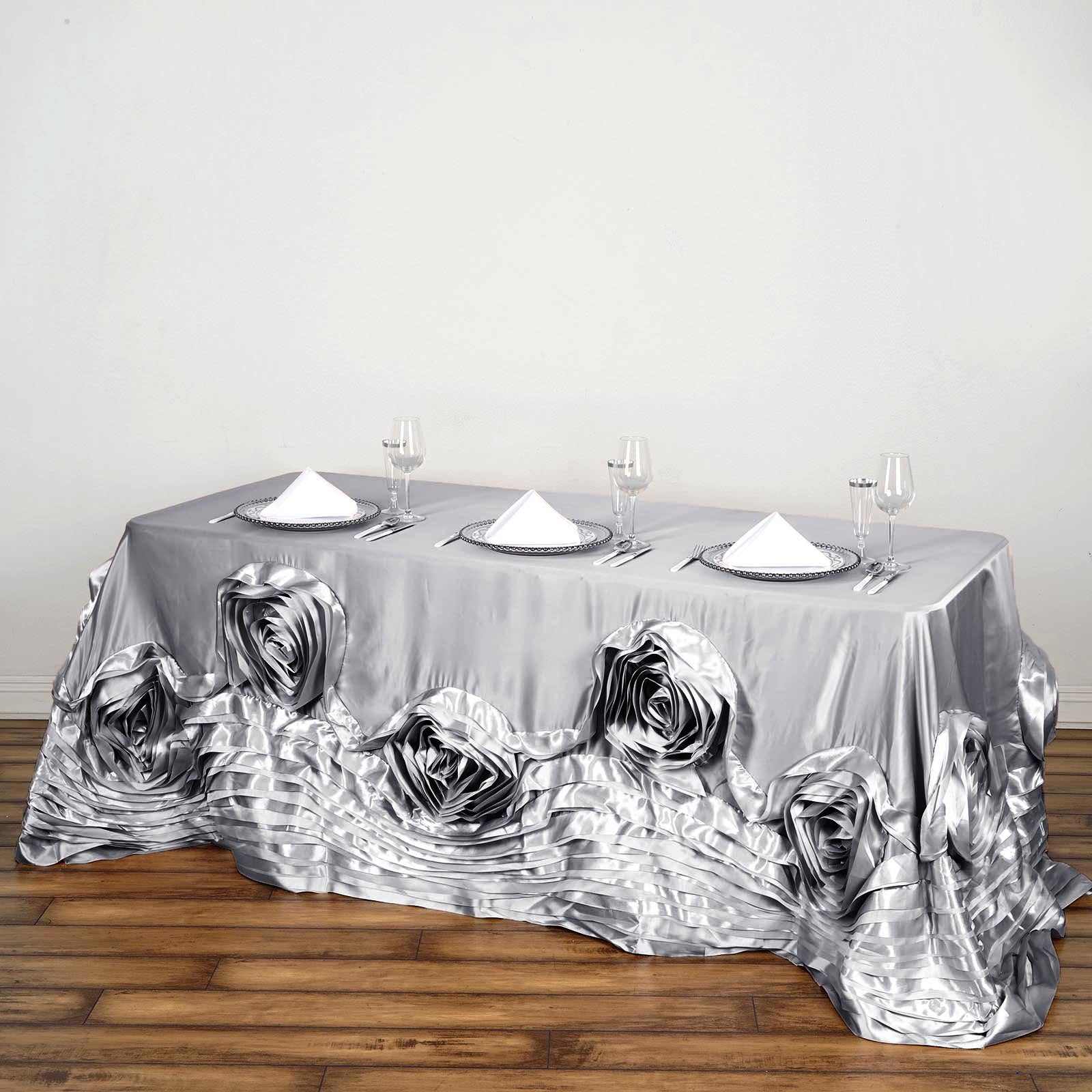 Silver Seamless Large Rosette Rectangular Lamour Satin Tablecloth 90"x132"