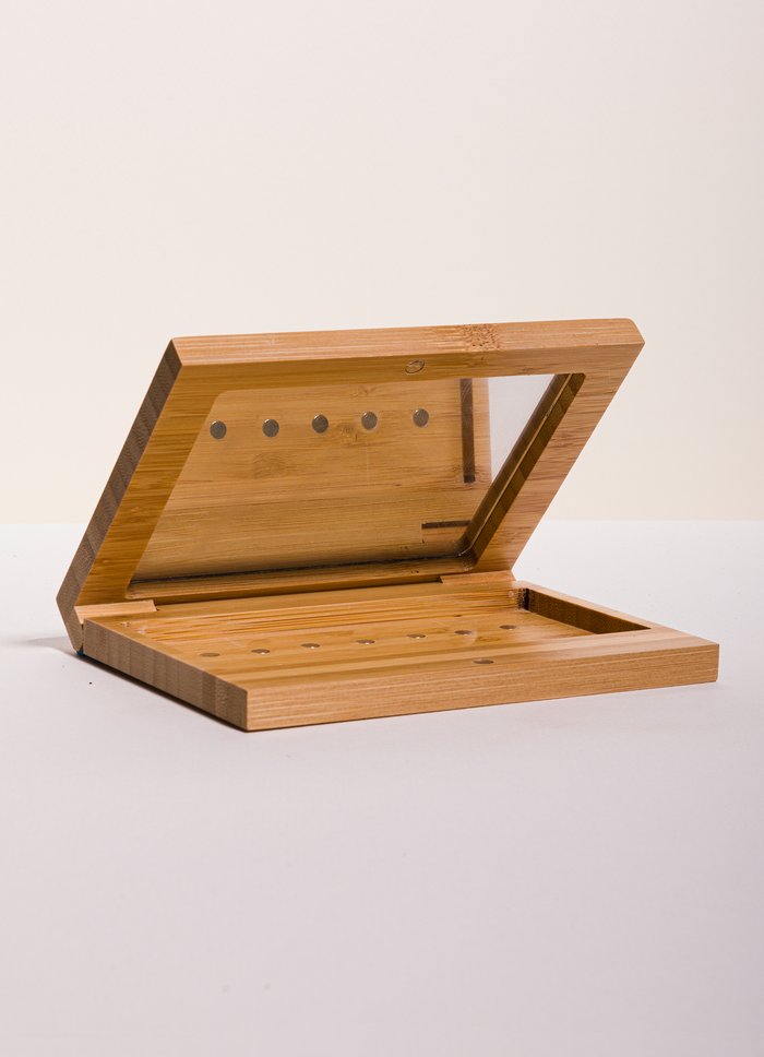 Elate palettes are made of water-treated bamboo and will fit any magnetic pan. The Essential Palette features a mirror on the inside.