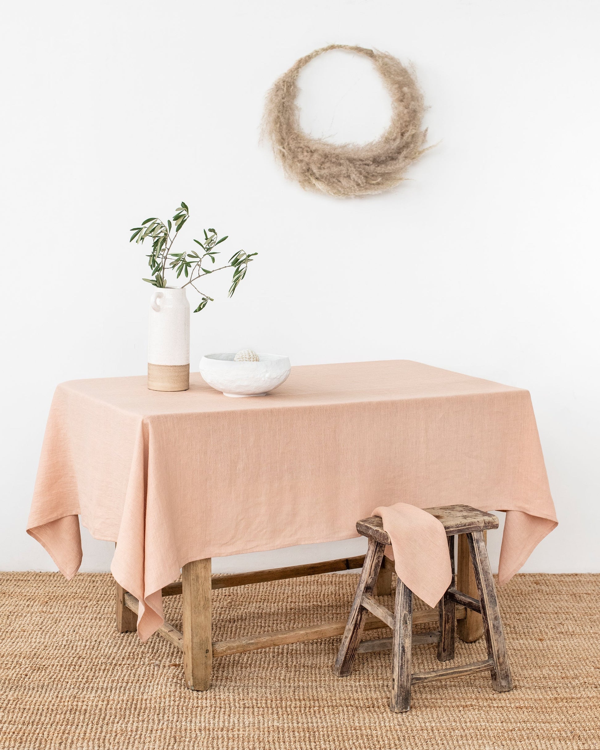 Linen tablecloth available in peach color. Be it casual dinners or formal occasions, this linen tablecloth goes well with every mood and setting. Finished with a simple seam, it gives off a contemporary look and is easy to mix and match with linen napkins, runners, and placemats.